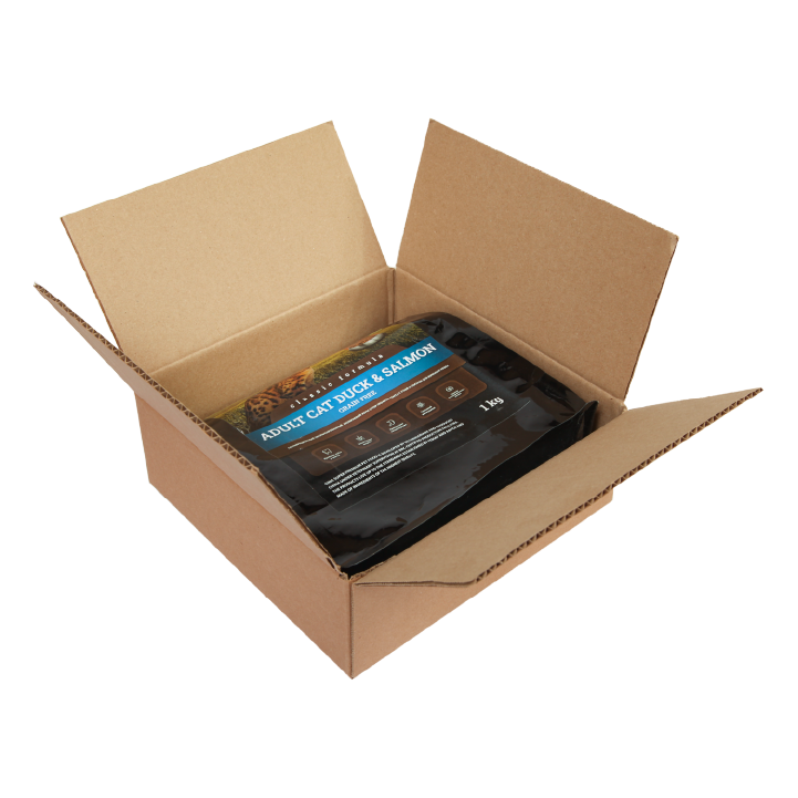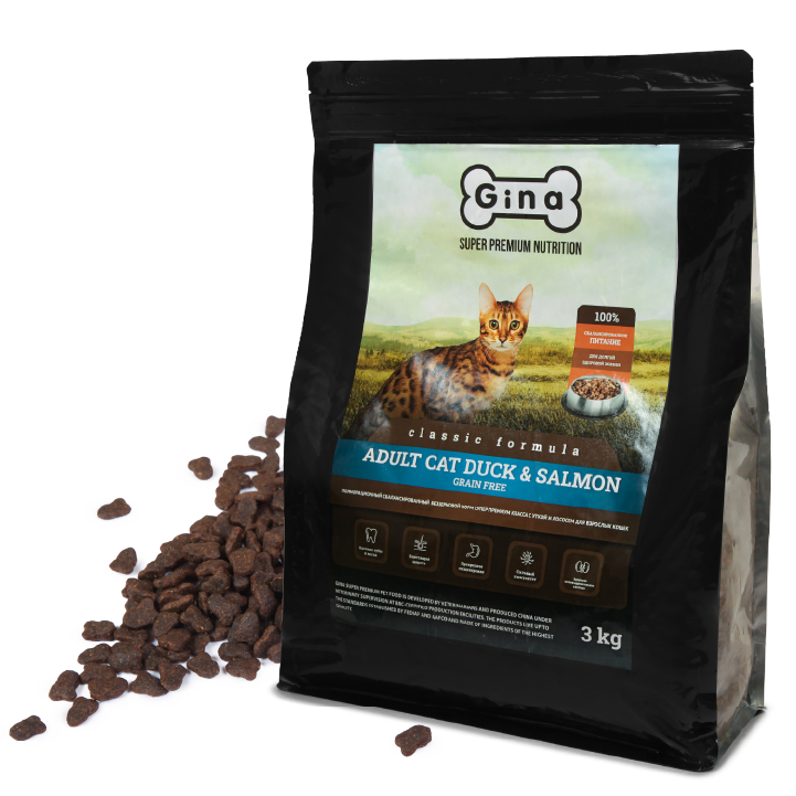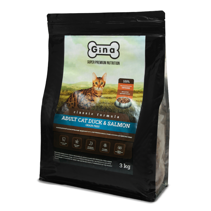 Ингредиенты: свежая утка (40%), сушеная утка (10%), лосось (15%), картофельная мука, мука из маниоки, куриный жир, гороховая мука, мука из пивных дрожжей, тыквенная мука, яблочная мука, сельдерейная мука, люцерновая мука, клюквенная мука, подорожниковая мука, лососевая мука, зародыши ячменя, юкковая мука, авокадо.