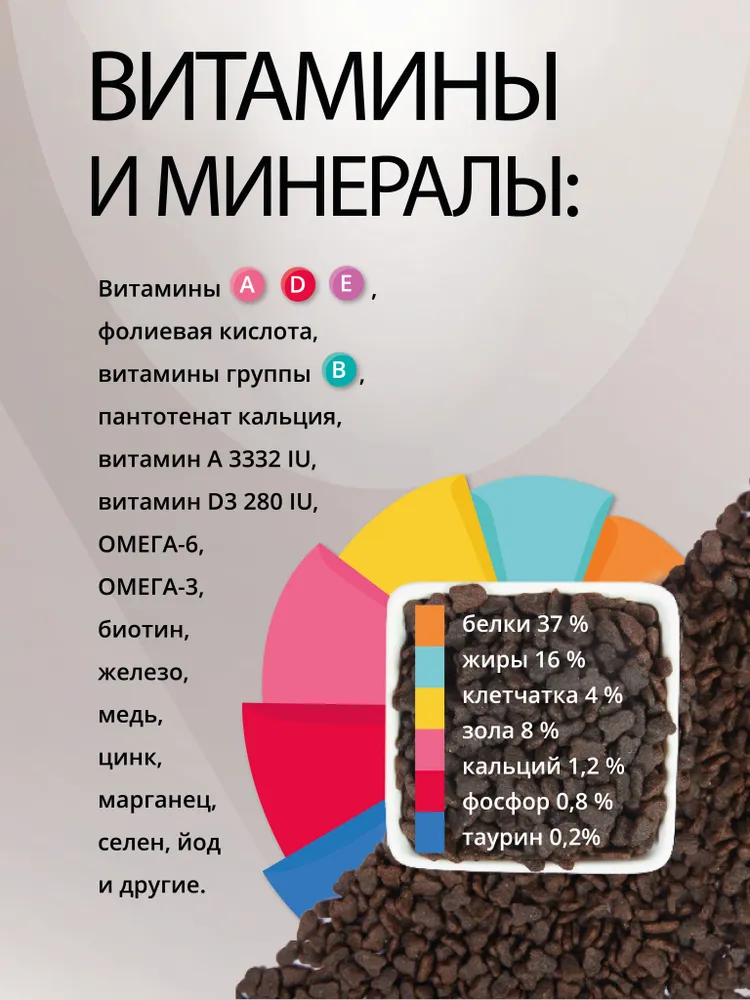 Процентное содержание: белок 37%, жир 16%, клетчатка 4%, зола 8%, влажность 8%, кальций 1.2%, фосфор 0.8%, таурин 0.2%.