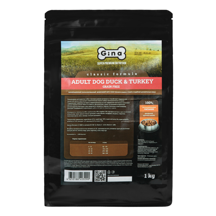 Ингредиенты: свежая утка 40%, сушёная утка 10%, индейка 15%, картофельная мука, мука из маниоки, утиный жир, горох, мука из пивных дрожжей, тыква, яблоко, сельдерей, люцерна, спирулина, лососевое масло, юкка, авокадо, экстракт розмарина.